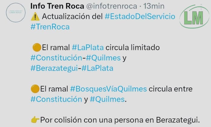Ver nota... SERVICIO LIMITADO EN EL TREN ROCA TRAS ARROLLAR A UNA PERSONA EN BERAZATEGUIAutor: Redacción