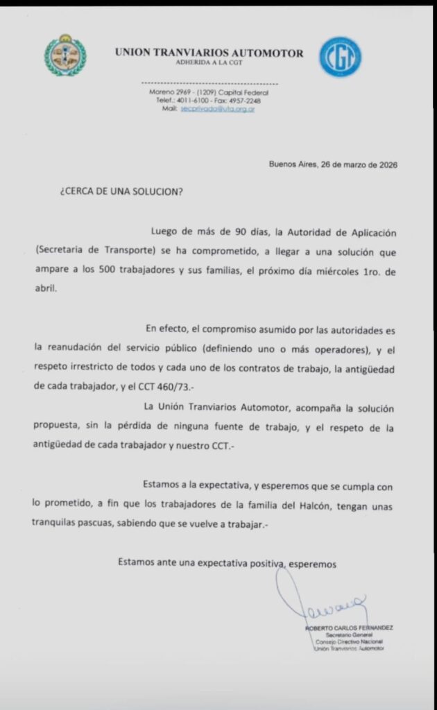 La UTA anunció que la Secretaría de Transporte de la Nación se comprometió a resolver el conflicto de la línea 148 el próximo miércoles 1 de abril. Tras más de 90 días de incertidumbre y dos semanas sin servicio, las autoridades buscan garantizar la continuidad de los 500 trabajadores de la empresa El Nuevo Halcón y sus familias.