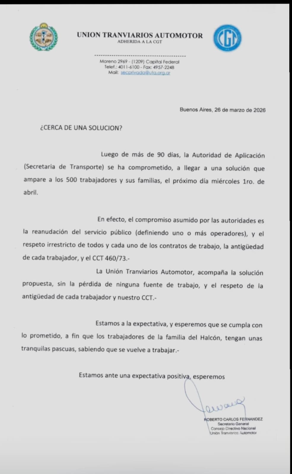 Comunicado oficial de la UTA: