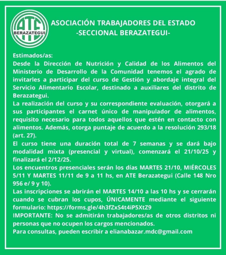 La Asociación Trabajadores del Estado (ATE) Seccional Berazategui invita a auxiliares del distrito a participar en el Curso de Gestión y Abordaje integral del Servicio Alimentario Escolar. Este curso, organizado junto a la Dirección de Nutrición y Calidad de los Alimentos del Ministerio de Desarrollo de la Comunidad, tendrá una duración total de 7 semanas bajo una modalidad mixta (presencial y virtual). Los participantes que aprueben la evaluación obtendrán el carnet único de manipulador de alimentos, requisito indispensable para quienes trabajan con alimentos, además de otorgar puntaje según la resolución 293/18 (art. 27). Es importante destacar que solo se admitirán trabajadores/as del distrito que ocupen los cargos mencionados.