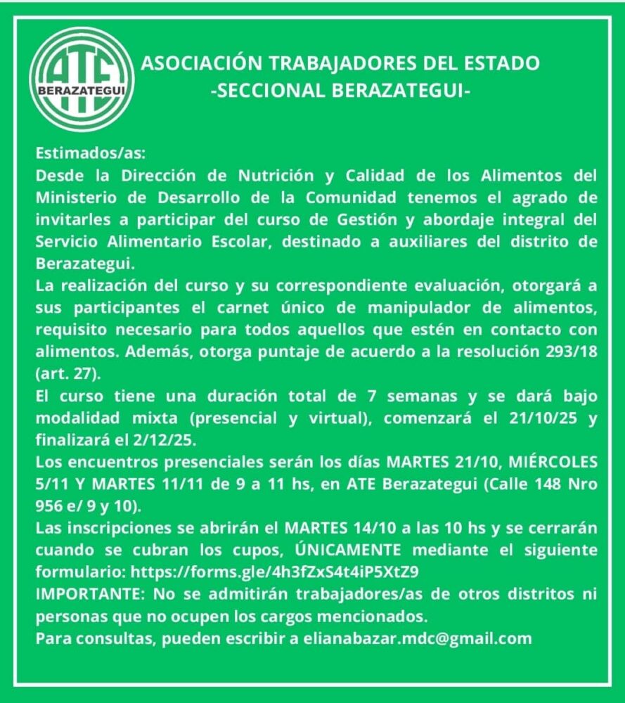 La Asociación Trabajadores del Estado (ATE) Seccional Berazategui invita a auxiliares del distrito a participar en el Curso de Gestión y Abordaje integral del Servicio Alimentario Escolar. Este curso, organizado junto a la Dirección de Nutrición y Calidad de los Alimentos del Ministerio de Desarrollo de la Comunidad, tendrá una duración total de 7 semanas bajo una modalidad mixta (presencial y virtual). Los participantes que aprueben la evaluación obtendrán el carnet único de manipulador de alimentos, requisito indispensable para quienes trabajan con alimentos, además de otorgar puntaje según la resolución 293/18 (art. 27). Es importante destacar que solo se admitirán trabajadores/as del distrito que ocupen los cargos mencionados.