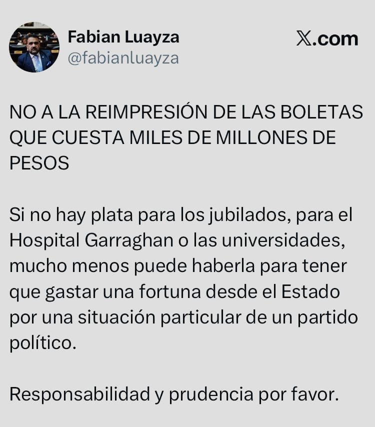 A través de sus redes sociales, el diputado provincial Fabián Luayza se manifestó en contra de la intención de reimprimir las boletas para las elecciones nacionales previstas para el 26 de octubre. “No se puede gastar una fortuna”, dijo.