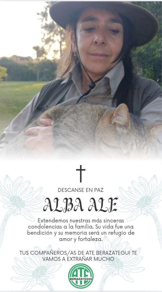 Finalmente, desde la Asociación de Trabajadores del Estado (ATE) Seccional de Berazategui expresamos nuestras condolencias a los familiares, compañeros y allegados de Alba en este difícil momento. En este sentido, “Vuela alto compañera Alba, no es un adiós sino una hasta pronto”, como lo expresaron desde la organización gremial. Su legado seguirá vivo en la lucha por la defensa del medio ambiente. Alba fue secretaria de Género y Diversidad de la seccional y una luchadora incansable por los derechos de los guardaparques.