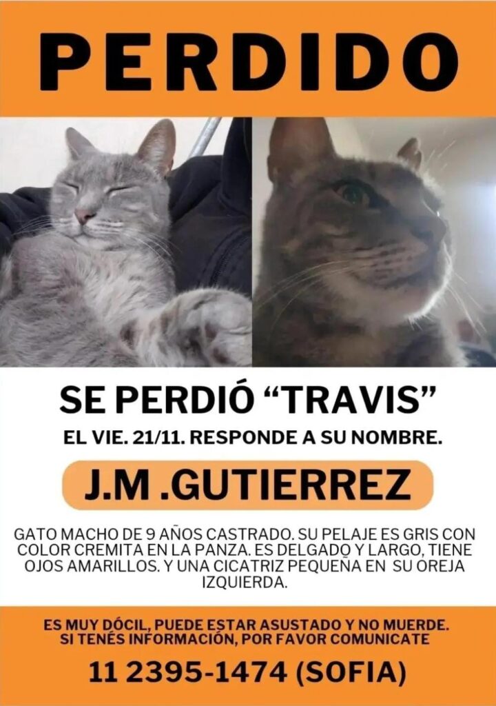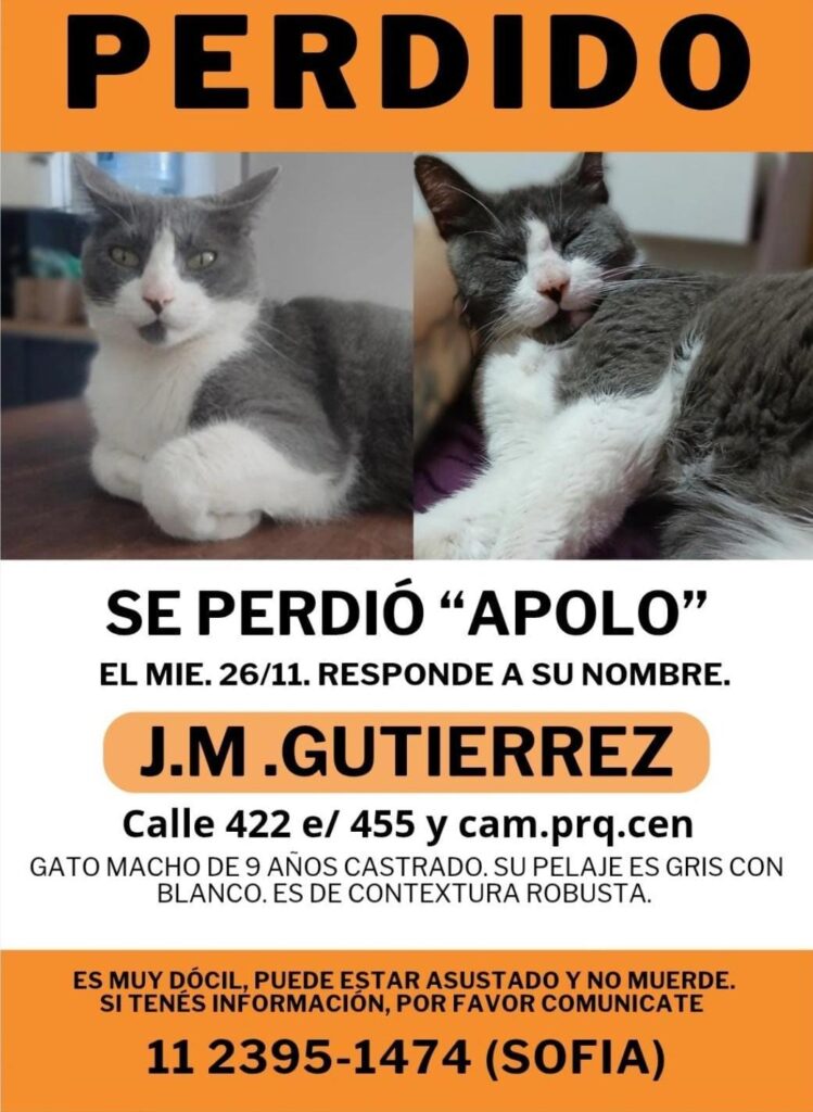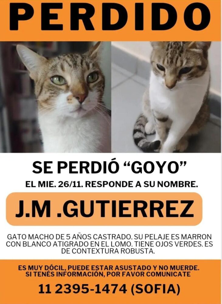 La familia ruega por la máxima difusión para encontrar a sus “familiares”, cuyos detalles y fotos han sido empapelados por todo el barrio. Goyo es marrón y blanco atigrado con ojos verdes; Travis es gris con una cicatriz en la oreja izquierda; y Apolo es gris y blanco. Si alguna persona tiene información sobre el paradero de estos tres gatos, por favor comuníquese de manera urgente con Sofía al número 11 2395-1474. Se insiste en que los tres son muy dóciles y están en una situación de riesgo.