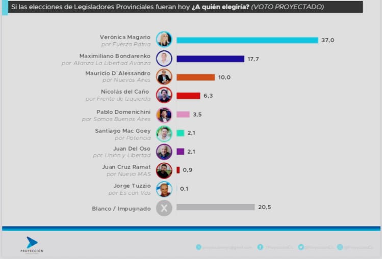 El dato surge a partir del último relevamiento de opinión publica que realizó Proyección Consultores. En dicho informe se señala que si las elecciones a legisladores provinciales fueran hoy el 37% de las personas votarían a Verónica Magario de Fuerza Patria; el 17,7% a Maximiliano Bondarenko de La Libertad Avanza, y en el tercer lugar se ubica con 10 puntos Mauricio D´Alessandro por Nuevos Aires.