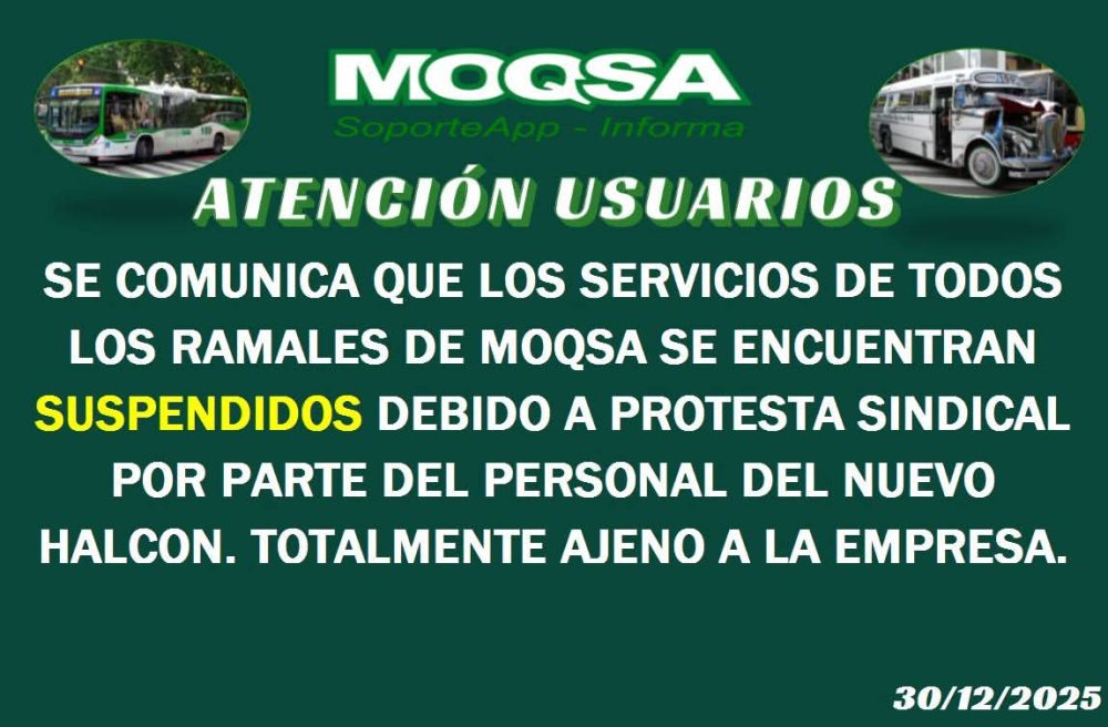 A través de un comunicado oficial emitido bajo el sello “SoporteApp Informa”, MOQSA comunicó a sus usuarios que todos sus ramales se encuentran totalmente suspendidos. La empresa aclaró que esta situación es “totalmente ajena” a su voluntad, ya que la medida de fuerza es llevada a cabo por personal de El Nuevo Halcón que impide la circulación.