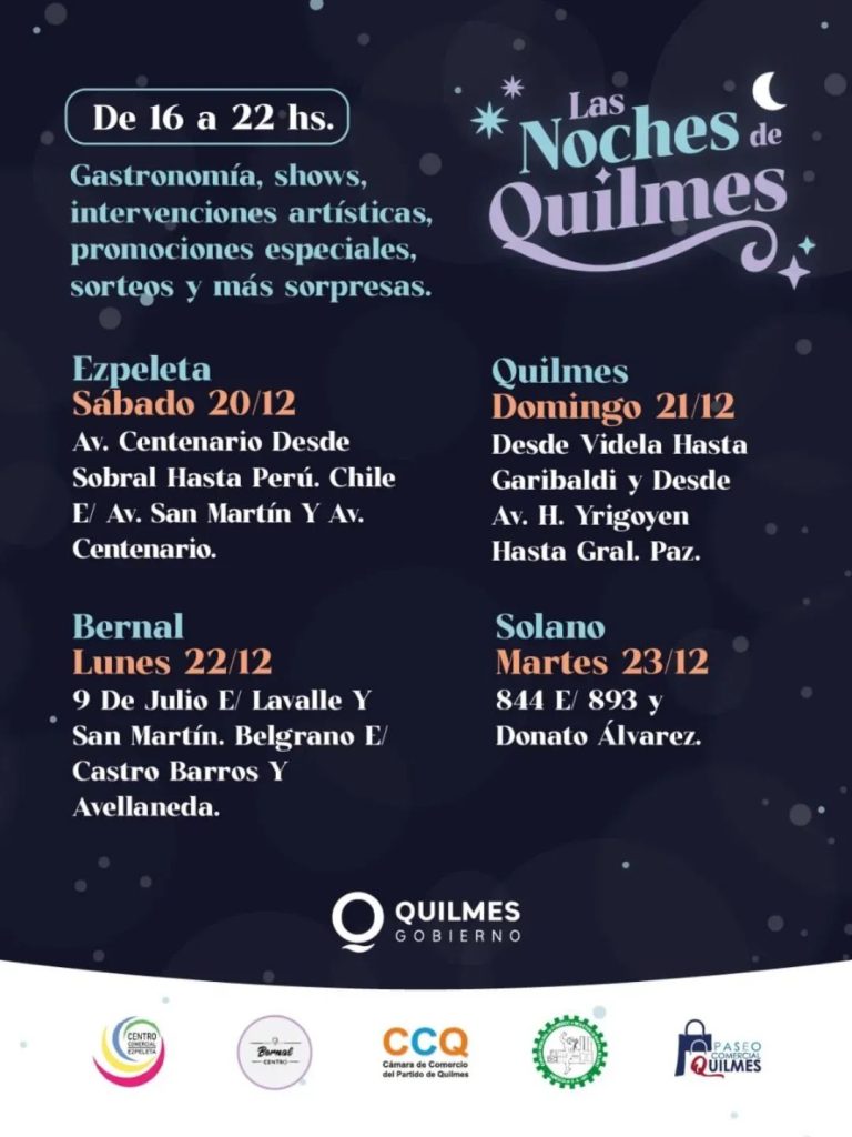 La ciudad de Quilmes se prepara para vivir cuatro jornadas de festejos y diversión con “Las Noches de Quilmes”. En este sentido, del 20 al 23 de diciembre, diferentes barrios del distrito se convertirán en el epicentro de la fiesta, con gastronomía, shows, intervenciones artísticas, promociones especiales, sorteos y sorpresas. Al respecto, los vecinos y visitantes podrán disfrutar de una amplia variedad de actividades.