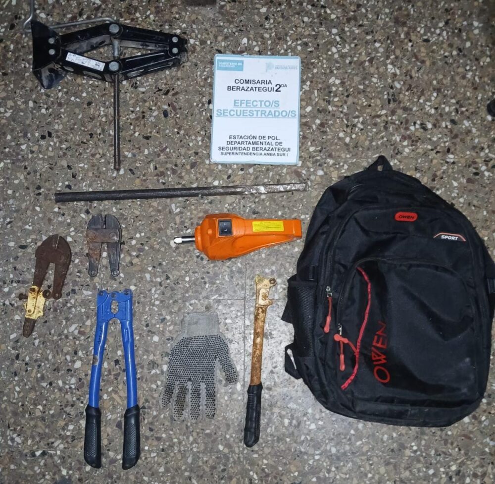 Efectivos de la Comisaría 2da de Ranelagh interceptaron a un hombre de 40 años que circulaba en un Volkswagen Vento oscuro tras una denuncia vecinal sobre movimientos sospechosos en la zona de calle 305 y 362. Durante la requisa del rodado, el personal policial incautó una mochila que contenía herramientas de corte, tales como alicates corta hierro y un corta fierro, además de gatos hidráulicos, un teléfono celular y dinero en efectivo.