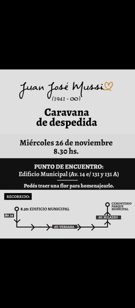 La comitiva partirá desde allí y seguirá un recorrido preestablecido, pasando por Avenida Vergara, hasta llegar al Cementerio Parque Municipal, ubicado en Avenida Milazzo. Los vecinos podrán llevar una flor para rendir un sentido homenaje a Mussi y despedirse de él en este adiós definitivo.