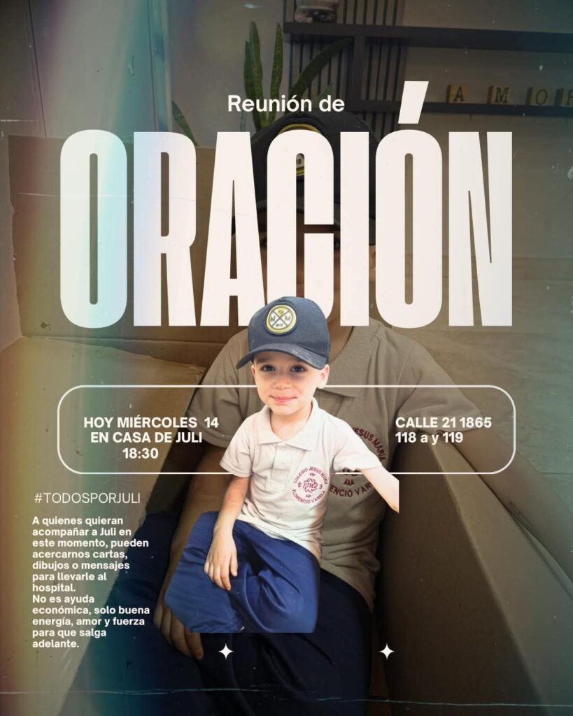 La comunidad se encuentra movilizada bajo el lema #TODOSPORJULI para brindar apoyo a un pequeño que atraviesa un momento de salud delicado en el hospital. Se invita a vecinos y allegados a participar de una reunión de oración que tendrá lugar hoy, miércoles 14, a las 18:30 horas. El encuentro se realizará en la casa de Juli, ubicada en la calle 21 N° 1865, entre las calles 118 y 119, Berazategui.