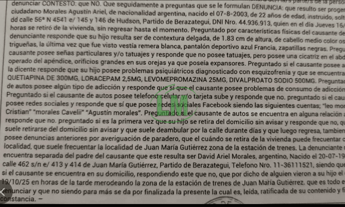 Se solicita colaboración urgente para encontrar a Morales Agustín Ariel, de 22 años, desaparecido desde el jueves 16 de octubre de 2025 de su domicilio en Hudson, Berazategui. Agustín es delgado, de 1,83 cm de altura, cabello oscuro y tez trigueña. La última vez que fue visto vestía remera blanca, pantalón deportivo azul Francia y zapatillas negras. Es crucial su hallazgo, ya que padece esquizofrenia y requiere medicación constante. Su madre contactó a La Misión Informa para difundir esta alerta. La última información lo sitúa merodeando la zona de la estación de trenes de Juan María Gutiérrez el sábado 18 de octubre.