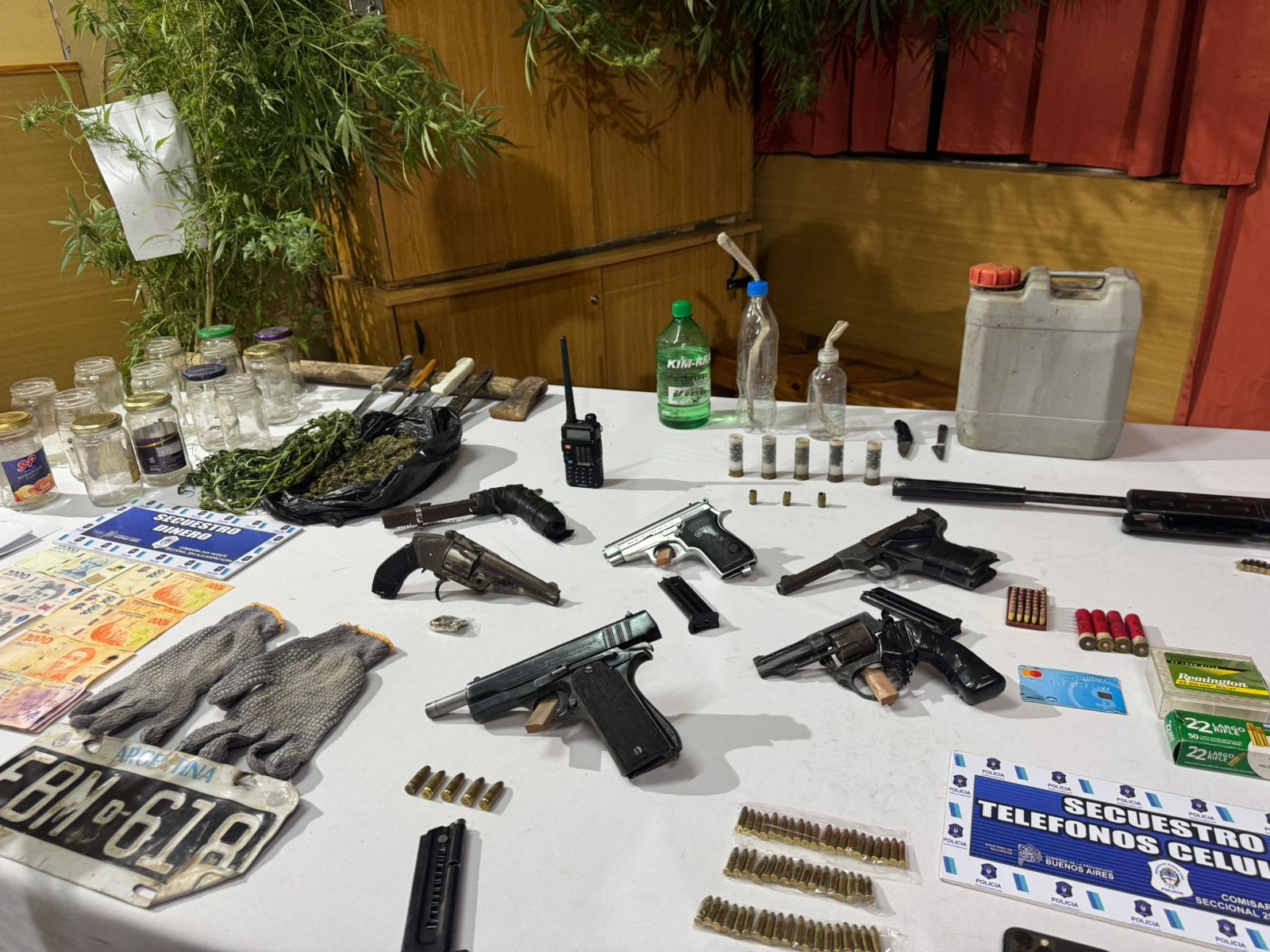 Además del armamento, los efectivos policiales incautaron 15 kilos de plantas de marihuana, cogollos, dinero en efectivo y seis bicicletas de alta gama. La causa quedó bajo la órbita de la UFID San Vicente y la Unidad Funcional de Instrucción y Juicio de Responsabilidad Penal Juvenil N° 4 de La Plata, encargada de la situación legal del menor involucrado. Los detenidos adultos fueron trasladados para su declaración judicial, mientras que la fiscalía especializada dispuso la notificación correspondiente para el adolescente.