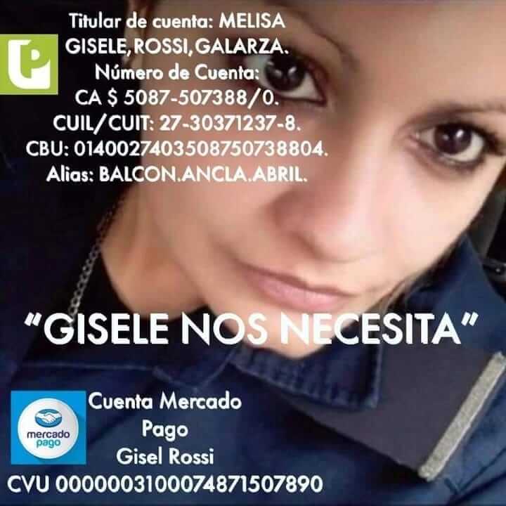 Gisele Rossi Galarza, de 35 años, es mamá de dos hijos pero ahora quedo sin poder trabajar. Su familia organizó una colecta solidaria y difundió los datos de su cuenta bancaria para quienes quieran colaborar.